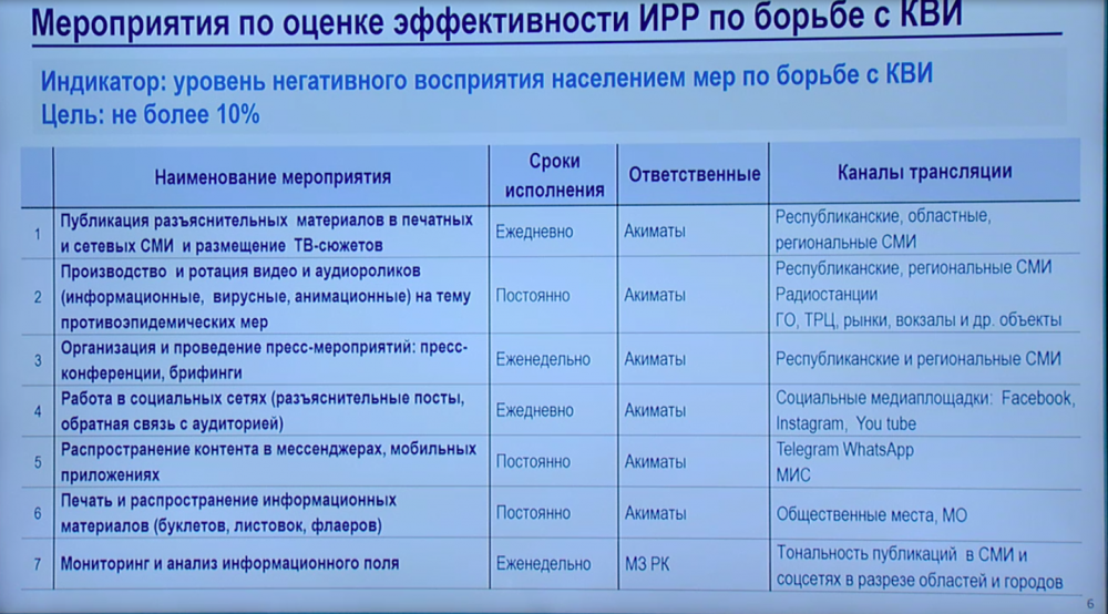 "По новому показателю, который показывает эффективность разъяснительной работы по борьбе с COVID-19, должны быть реализованы мероприятия, которые в плане должны повысить уровень осведомленности населения при проводимых мероприятиях. Акиматам необходимо обеспечить реализацию данных мероприятий", - сказал Цой.