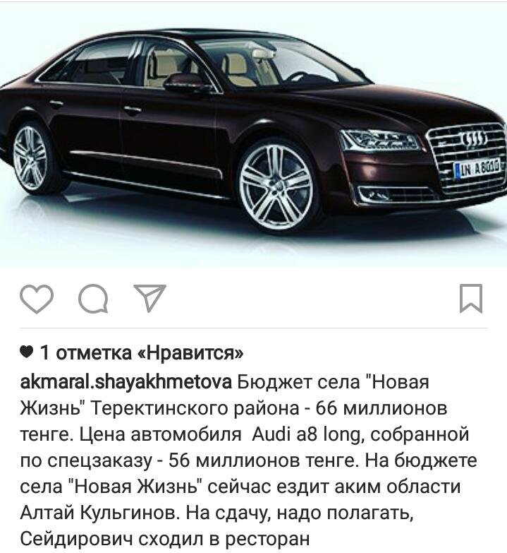 «Бюджет села «Новая жизнь» Теректинского района – 66 миллионов тенге. Цена автомобиля Audi A8 Long, собранной по спецзаказу – 56 миллионов тенге. На бюджете села «Новая жизнь» сейчас ездит аким области Алтай Кульгинов. На сдачу, надо полагать, Сейдирович сходил в ресторан», пишет пользователь инстаграма.
