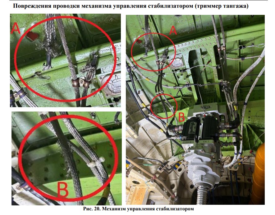 Кроме того, есть фотографии, содержащие доказательства повреждений электрической проводки управления привода стабилизатора (триммера по тангажу) до столкновения с землёй, "вероятно вызванные внешними объектами". Следствием таких повреждений будет неработоспособность первого и второго канала триммирования по углу тангажа.