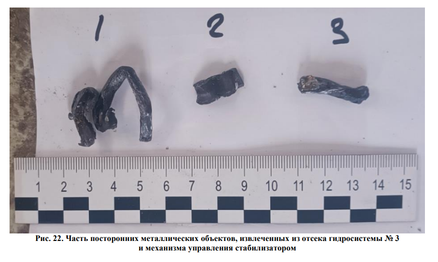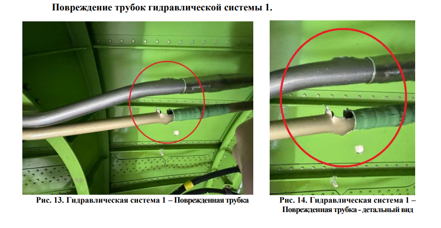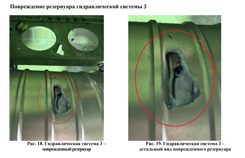 Показаны фотографии и график, содержащие доказательства повреждений гидравлических систем 1, 2 и 3 до столкновения с земной поверхностью, вероятно, вызванные внешними объектами, проникшими в компоненты воздушного судна. Эксперты отмечают, что следствием данных повреждений будет потеря гидравлической жидкости/давления.