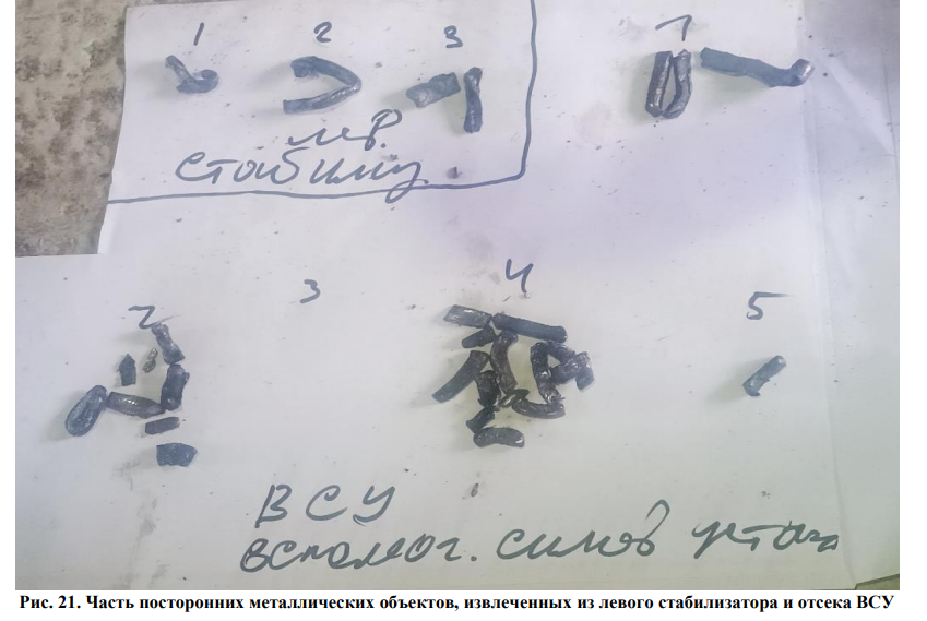 "Первоначальный осмотр сохранившихся фрагментов выявил множество сквозных и несквозных повреждений разной величины и формы в хвостовой части фюзеляжа, киля и стабилизатора, рулей высоты и направления. Схожие повреждения были обнаружены на левом двигателе и левом крыле воздушного судна, а также на агрегатах и компонентах воздушного судна. В некоторых местах повреждения имеют правильную прямоугольную форму", - сказано в отчёте.
