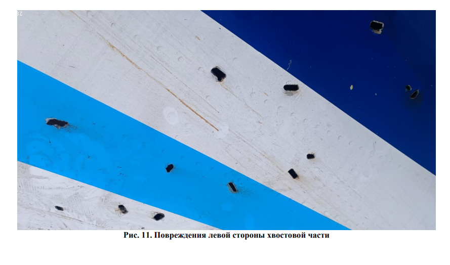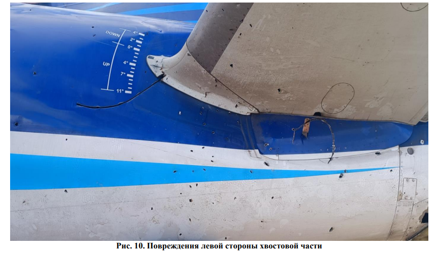 "Сквозные повреждения указывают на проникновения внешних объектов в конструкцию ВС. Большинство сквозных повреждений находятся в киле и стабилизаторе. Комиссией по расследованию в присутствии уполномоченных представителей Федеративной Республики Бразилия, Азербайджанской Республики и правоохранительных органов Республики Казахстан проведены действия по извлечению посторонних объектов, которые могли сохраниться в глухих повреждениях, для направления их на дополнительную судебную экспертизу. В результате из глухих повреждений извлечено большое количество посторонних объектов", - сказано в отчёте.