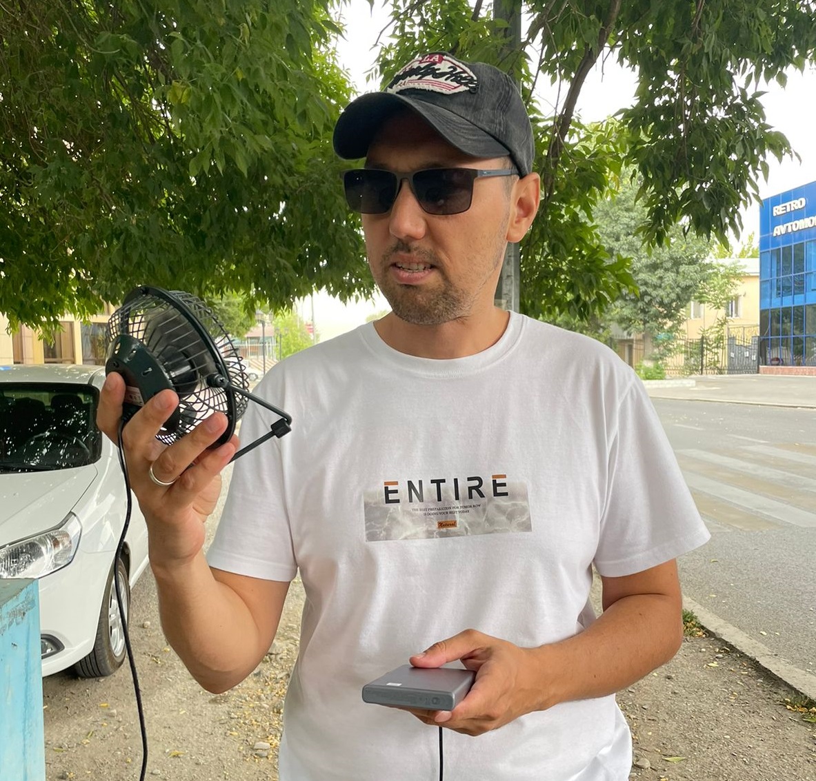 "Этот вентилятор я везде ношу с собой, он удобный, его можно подключить к компьютеру, в розетку или как я, в пауэрбэнк. Это очень удобно в жару. Есть такие же вентиляторы на батарейках, сейчас многие ими пользуются, потому что выходишь на улицу и сразу покрываешься капельками пота. В городе очень душно, даже утром уже жара такая невыносимая, что на улицу выходить не хочется, но по работе приходится", - рассказал житель Шымкента.