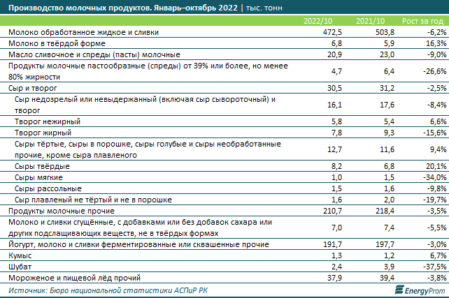 В натуральном выражении выпуск обработанного жидкого молока и сливок сократился на 6,2 процента, до 472,5 тысячи тонн; сливочного масла и спредов — на девять процентов, до 20,9 тысячи тонн; молочных пастообразных спредов — на 26,6 процента, до 4,7 тысячи тонн; сыра и творога — на 2,5 процента, до 30,5 тысячи. тонн; сгущённых молока и сливок — на 5,5 процента, до семи тысяч тонн; йогурта — на три процента, до 191,7 тысячи тонн, шубата — на 37,5 процента, до 2,4 тысячи тонн.