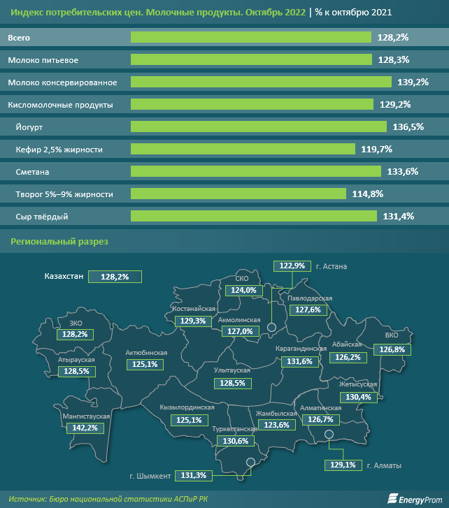 "В региональном разрезе рост цен на молочные продукты питания сильнее всего ощутили жители Мангистауской области: плюс 42,2 процента за год. В тройке антилидеров также оказались Карагандинская область (плюс 31,6 процента) и Шымкент (плюс 31,3 процента)", - уточнили аналитики.
