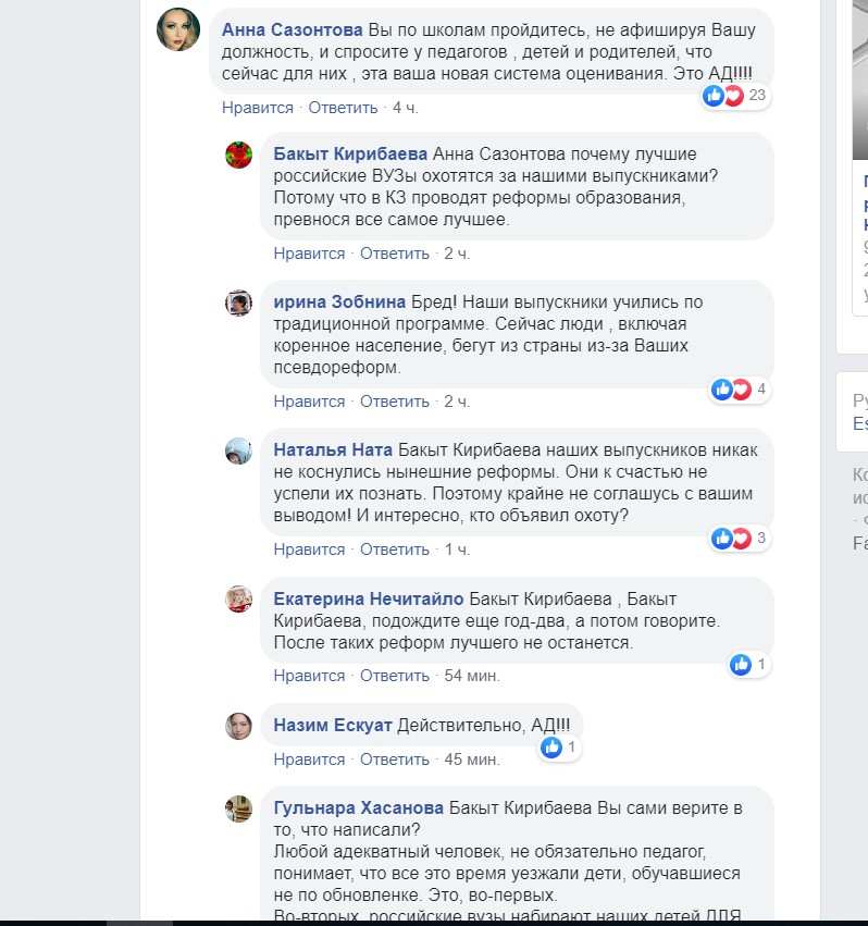 Также нашлись и сторонники реформ в образовании."Бла-бла... надоело. Верните то,что было. Нынешние дети через десять лет будут реально неграмотными,не умеющие читать, писать,говорить,а главное - думать! Не хотите признать свою ошибку МОН?!" - написала другой пользователь Шакура Сабитова.