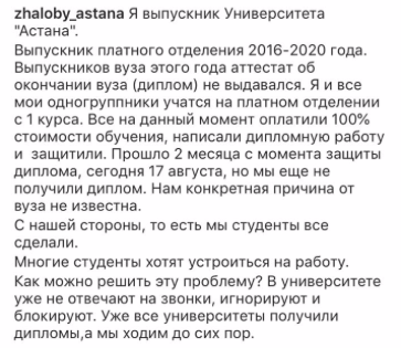 "Актауский гуманитарно-технический университет и Университет "Астана" не имеют аккредитации в аккредитационных агентствах, внесенных в реестр признанных аккредитационных органов. Кроме того, рейтинг образовательных программ вузов, проводимый НПП "Атамекен" в последние два года, показывает, что эти вузы находятся, в основном, на последних позициях. Согласно Закону РК "Об образовании" указанные вузы в настоящее время не могут выдать дипломы выпускникам 2020 года. С учетом интересов студентов последних курсов эти вузы обязаны пройти аккредитацию, чтобы обеспечить выдачу дипломов", - рассказали в ведомстве.