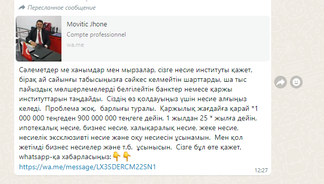 В мессенджере WhatsApp распространяется сообщение от имени некоего французского экономиста, готового предоставлять кредиты гражданам Казахстана. Связавшись с ним, якобы можно получить сумму от одного до девяти миллионов тенге. Аналитики Stopfake заявили, что информация не соответствует действительности, передаёт BaigeNews.kz.