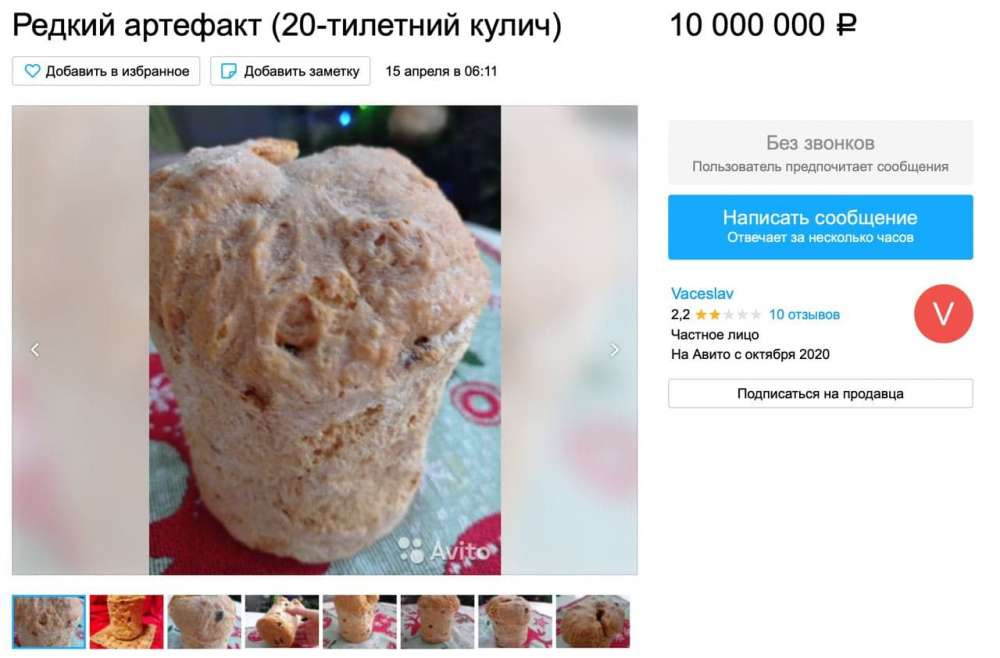 Накануне Пасхи на одном из сайтов бесплатных объявлений появилось сообщение о продаже кулича за 10 миллионов рублей, передает