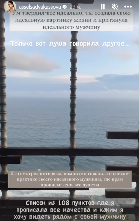"Идеальная картинка реальности - характер, качества, отношение ко мне, внешность, вот абсолютно все из моего списка. Живи и радуйся, Аселя. Планируй будущее, тем более все идет к тому, чтобы уже переходить на следующий уровень отношений. Все просто идеально. Только почему-то внутри с каждым днем становится так пусто и холодно", - пишет она.