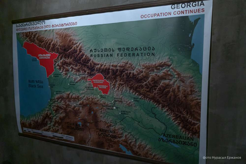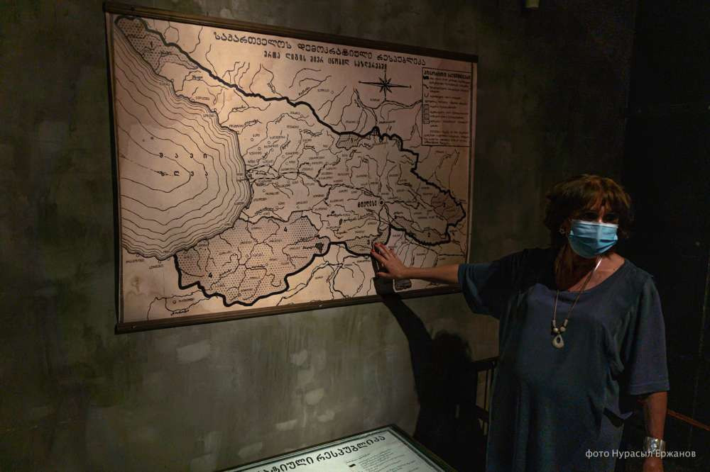 "Здесь (на карте выше) представлены оккупированные территории. Когда в 1921 году большевики пришли к власти, были созданы три маленькие республики — Абхазская автономная республика, Аджарская автономная республика, и с севера в центр Грузии спустились осетины. Для того, чтобы сделать им автономию, понадобилось целое грузинское поселение. И вот тогда создали Юго-Осетинскую автономную область. Эта территория у нас сейчас оккупирована", — рассказывает сотрудница музея.