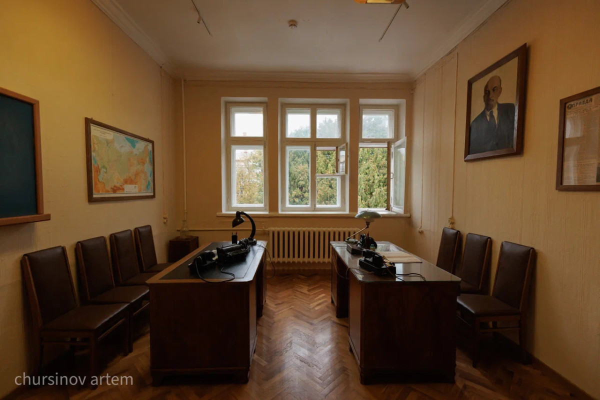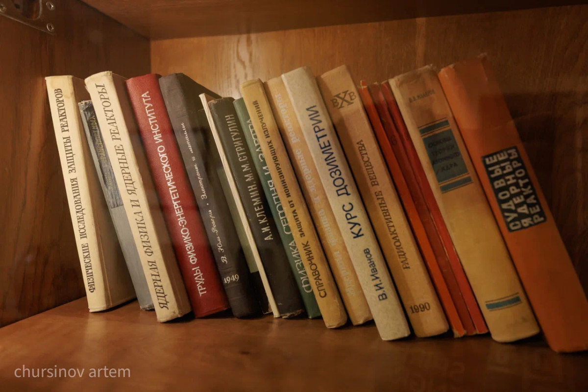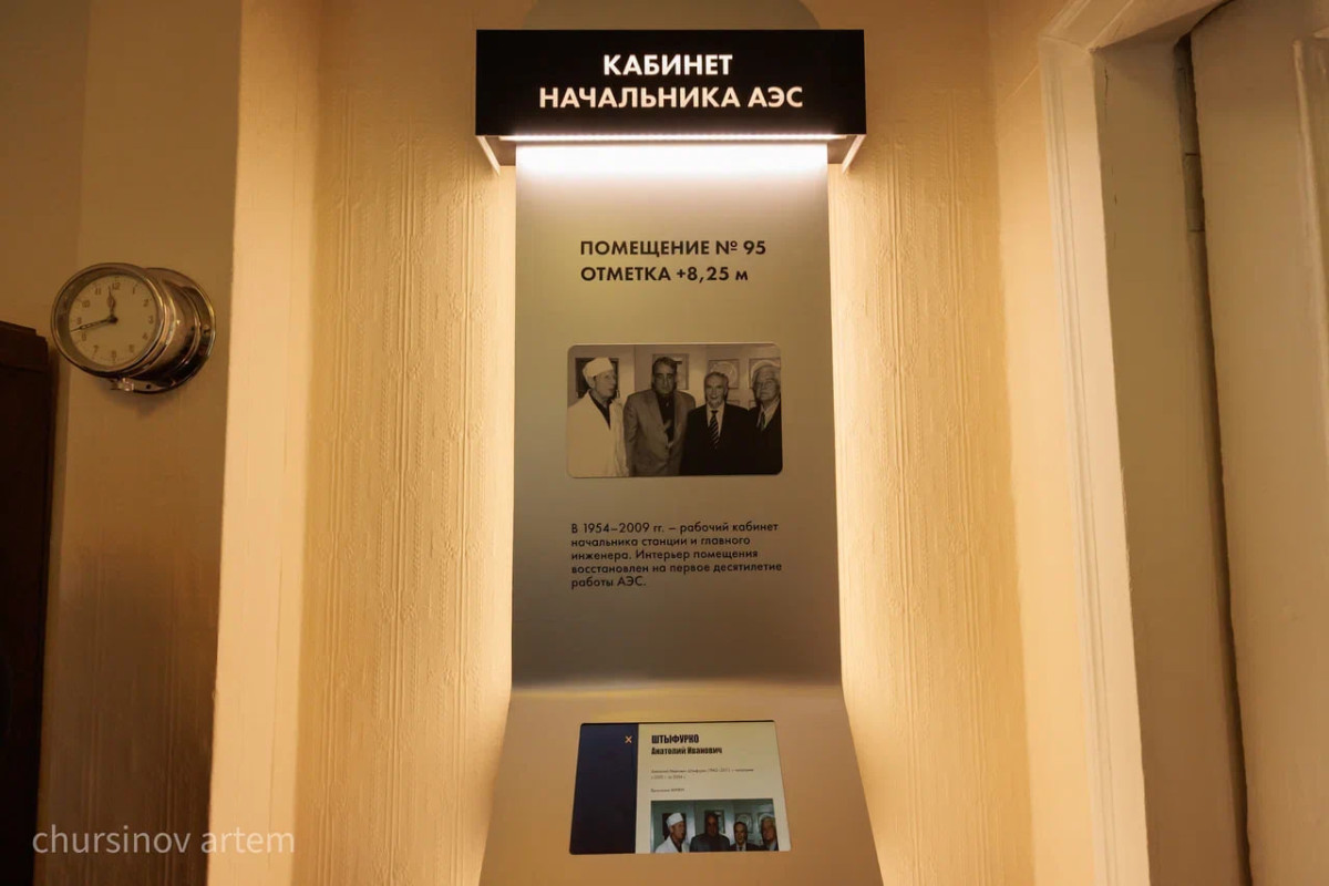 Кабинет начальника АЭС сохранил свой первозданный вид: здесь стоят корабельные часы — подарок флота, а в шкафах хранятся бюллетени, чертежи и журналы, отражающие дух времени.