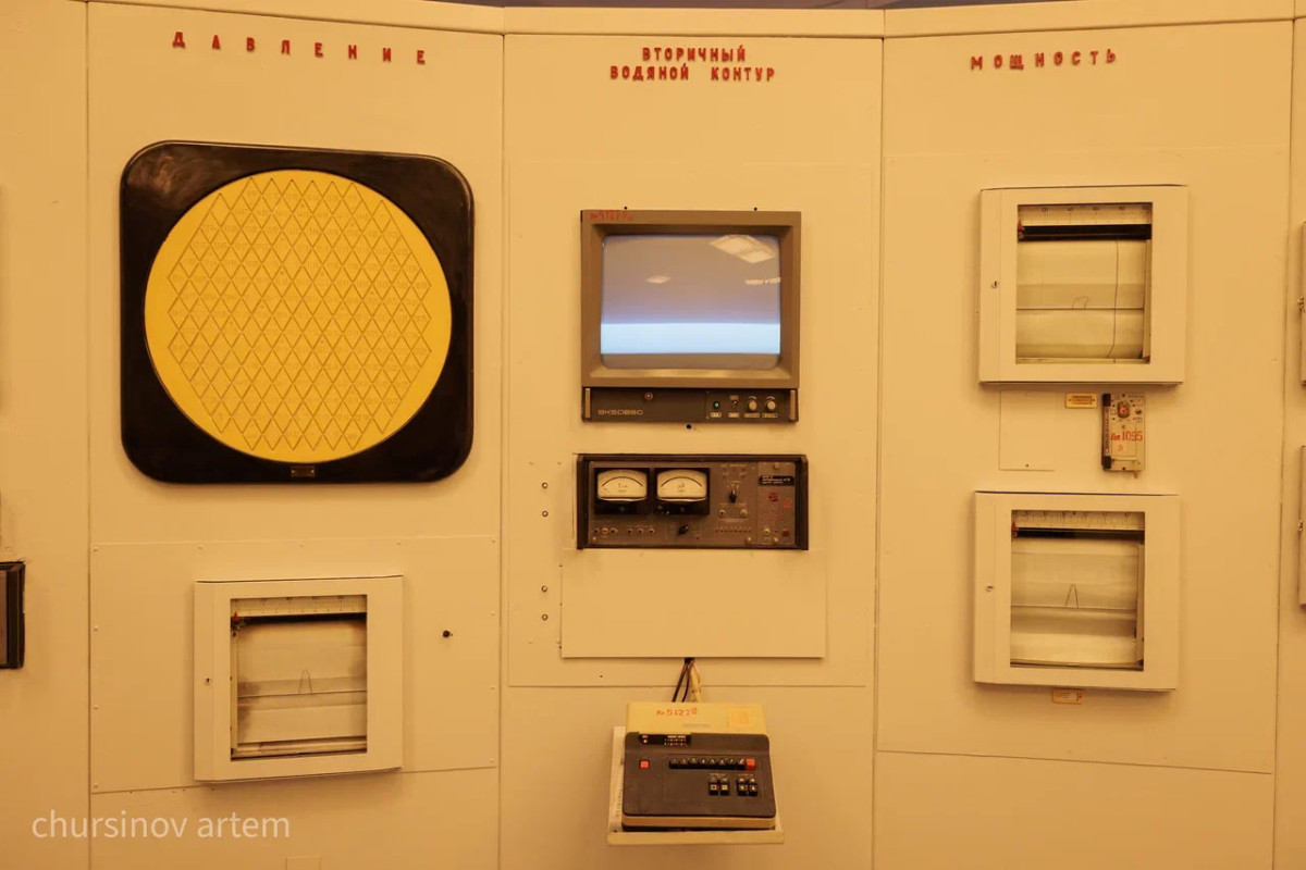 Центральный пульт управления Первой АЭС считался "мозгом" станции. Здесь дежурные контролировали все процессы: расход воды и пара, давление, температуру, мощность и другие показатели. На большом щите располагались десятки кнопок, тумблеров и шкал разных форм и цветов.