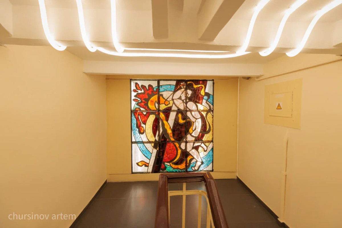 На лестничных пролетах станции можно увидеть витражи 1964 года, созданные к юбилею запуска АЭС. Они были полностью отреставрированы.