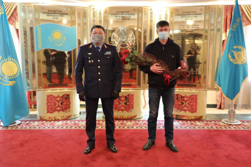 Руководитель столичной полиции генерал-майор Ержан Саденов поблагодарил Дениса Синдеева за отважный поступок и вручил ему благодарственное письмо и ценный подарок.