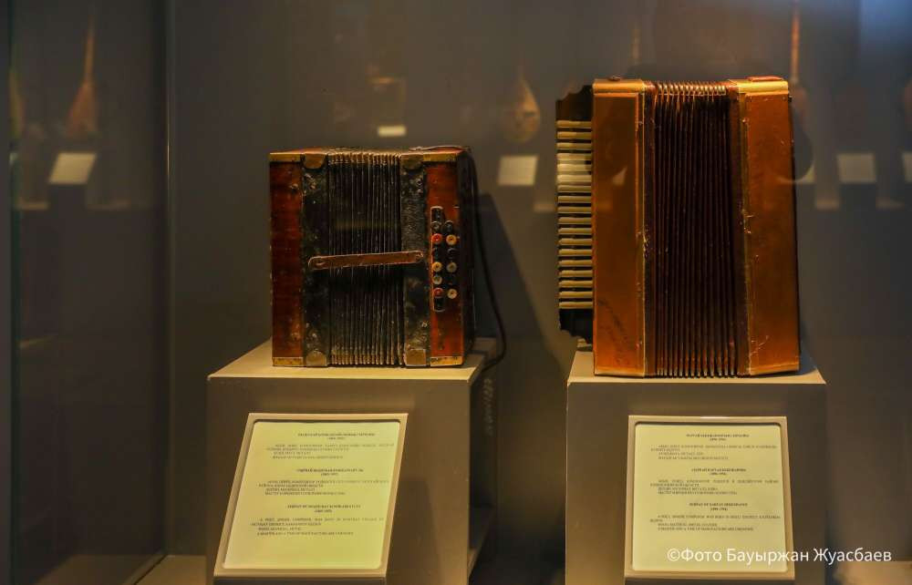 Кроме того, в экспозиции представлены баяны, принадлежавшие заслуженному деятелю искусств Казахской ССР Шашубаю Сырнаю и композитору Нартаю Сырнаю.