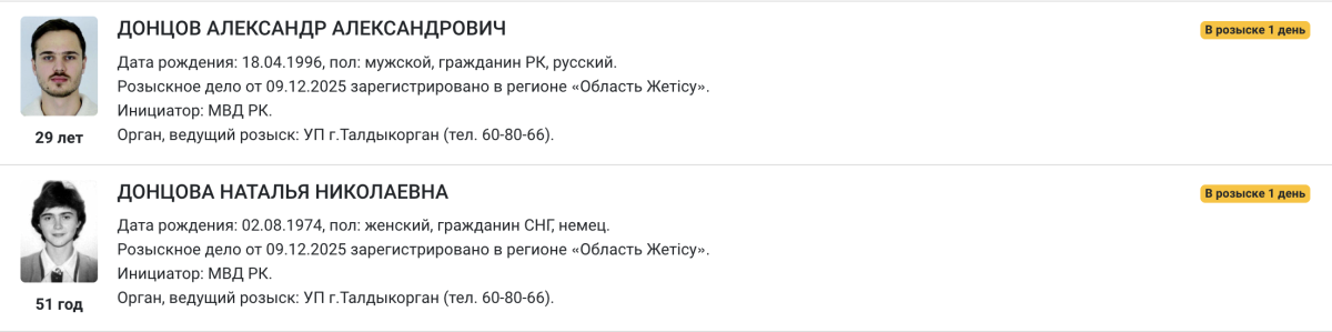 В розыск объявлены супруг погибшей — Александр Донцов, а также его мать, свекровь судьи — Наталья Донцова. Их разыскивают в рамках расследования уголовного дела об убийстве, совершённом в 2024 году за пределами Казахстана.