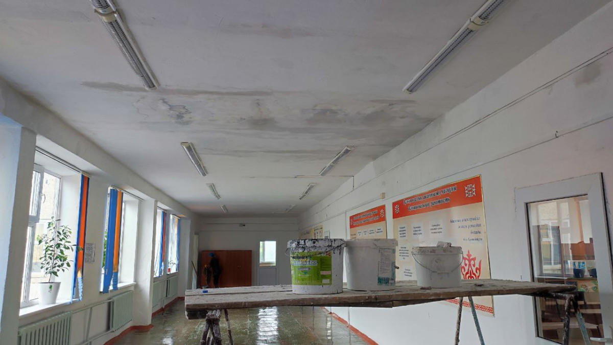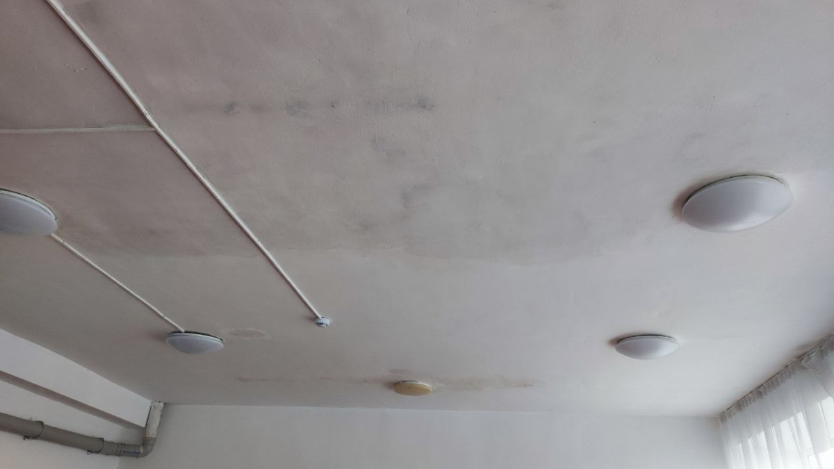 Ещё одна серьёзная и многолетняя проблема школы №34 - протекающая крыша. Кровля признана аварийной. На её капитальный ремонт нужно больше 130 миллионов тенге. В ходе экскурсии по школе было видно как техперсонал добеливал замазанный потолок, который пострадал из-за обильных дождей в первые дни учебного года.
