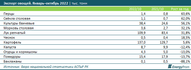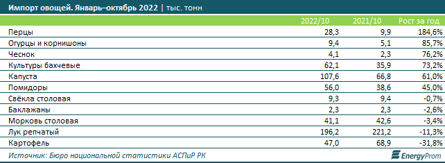 Аналитики отмечают, что по основным видам овощей импорт в РК в разы превосходит экспорт. Так, по итогам января–октября 2022 года импорт баклажанов превышал экспорт в 39,8 раза, перцев — в 20,5 раза, капусты — в 12,4 раза, столовой моркови — в 11,5 раза, столовой свёклы — в 8,8 раза, чеснока — в 8,7 раза, помидоров — в 3,6 раза, огурцов — в 2,2 раза, репчатого лука — в 1,8 раза, бахчевых культур — в 1,6 раза. И только экспорт картофеля превысил импорт в 2,9 раза.