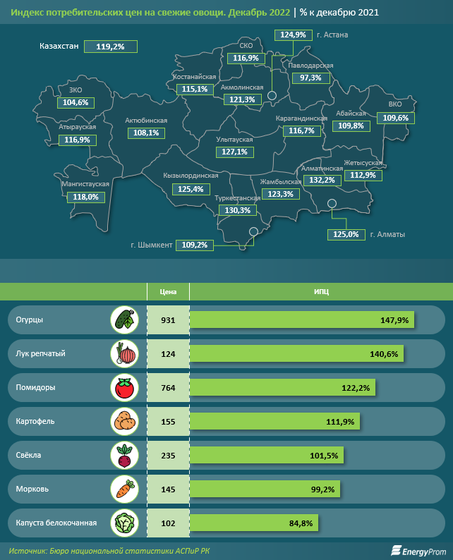 Резко выросли в цене огурцы (на 47,9 процента, до 931 тенге за килограмм), репчатый лук (на 40,6 процента, до 124 тенге), помидоры (на 22,2 процента, до 764 тенге), картофель (на 11,9 процента, до 155 тенге), также несколько подорожала свёкла (на 1,5 процента, до 235 тенге). Цены на морковь уменьшились за год на 0,8 процента, до 145 тенге, белокочанная капуста подешевела на 15,2 процента, до 102 тенге за килограмм.