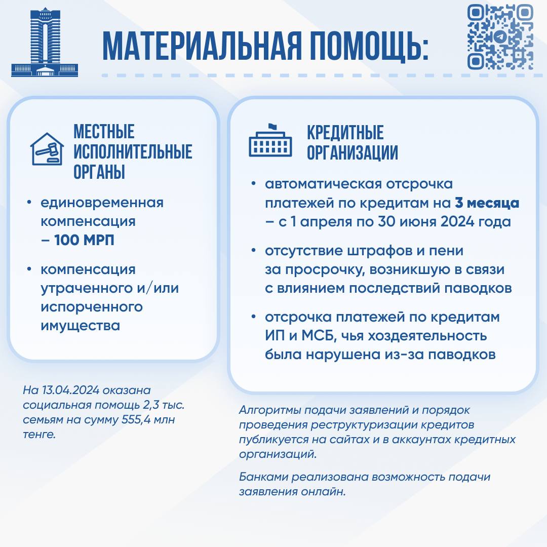 - всем гражданам, отнесенным к категории пострадавших от паводков, будет предоставлена автоматическая отсрочка платежей по кредитам на 3 месяца – с 1 апреля по 30 июня 2024 года (необходимо обратиться в акимат или в банк напрямую. Банками реализована возможность подачи заявления онлайн);