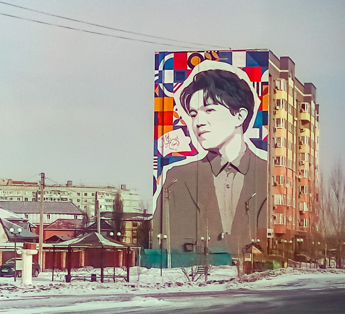 Первая городская достопримечательность, с которой встречается каждый, кто въезжает в Актобе со стороны аэропорта – это мурал с изображением Димаша Кудайбергена.