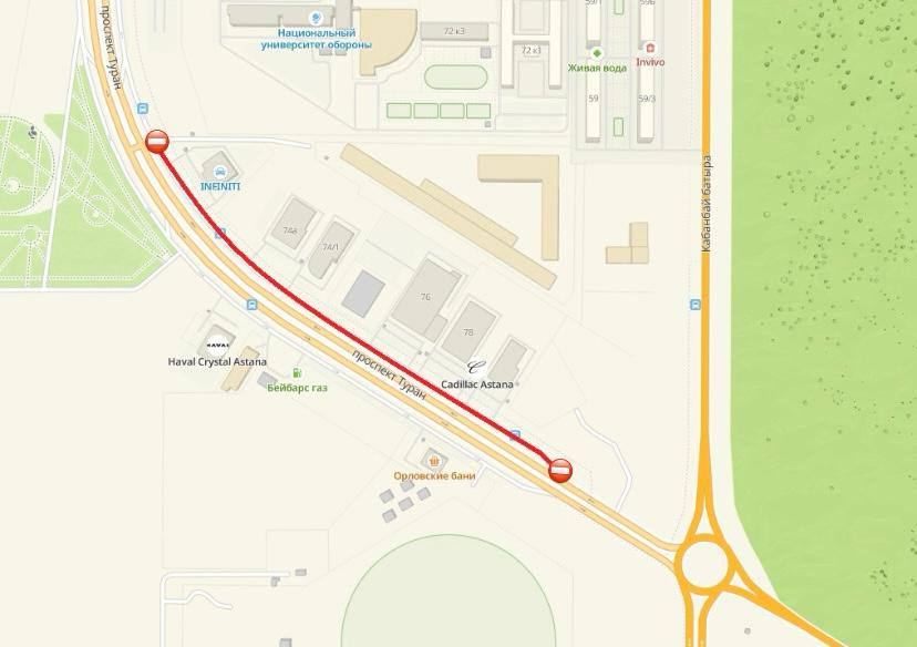 Кроме того, в связи с проведением работ по врезке сети канализации с 3 по 5 августа будет полностью перекрыт участок дороги на проспекте Туран (на схеме).