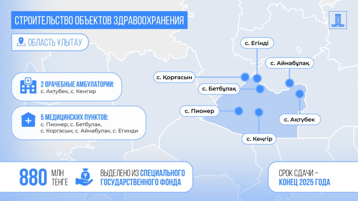 В частности, две новые врачебные амбулатории возводятся в селах Актубек и Кенгир, а пять медицинских пунктов строятся в Бетбулаке, Пионере, Коргасыне, Айнабулаке и Егинди. Сдача объектов в эксплуатацию планируется до конца текущего года.