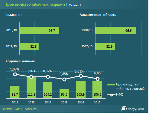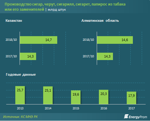 В Казахстане выпуск табачной продукции вырос на 2,6% в этом году, говорится в исследовании Energyprom.kz.