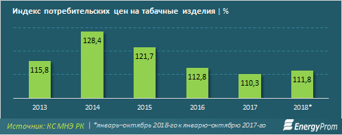 За 10 месяцев этого года стоимость табачных изделий увеличилась на 11,8% в сравнении с аналогичным периодом 2017 года. Наибольший рост цен наблюдался в 2014 году — сразу на 28,4% за год.