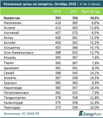 В октябре цена пачки сигарет уже достигла 393,13 тенге, что на 10,5% выше, чем годом ранее.