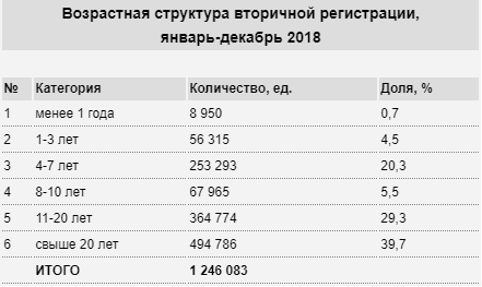 Свыше двух третей (69,0%) транспортных средств, повторно зарегистрированных с начала 2018 года, составила техника в возрасте старше 10 лет. Наибольшую долю заняли машины старше 20 лет (39,7% или 494 786 ед.), от 11 до 20 лет – 29,3% (364 774 ед.), от четырёх до семи лет – 20,3% (253 293 ед.), от восьми до 10 лет – 5,5% (67 965 ед.), от одного года до трёх лет – 4,5% (56 315 ед.), в возрасте менее одного года – 0,7% (8 950 ед.).