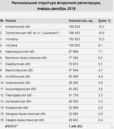 Наибольшее число вторичных регистраций в 2018 году зафиксировано в Алматинской (190 824 ед.) и Туркестанской (186 453 ед.) областях, а также Алматы (152 923 ед.). Жители Алматинской области зарегистрировали наибольшее количество транспортных средств в возрасте старше 20 лет (103 728 ед.; 21%). Следом по этому критерию расположились Туркестанская область (79 420 ед.; 16,1%) и Жамбылская область (41 302 ед.; 8,3%). Наибольшее число транспортных средств моложе одного года повторно зарегистрировано в Алматы (1 991 ед.; 22,2%), Астане (1 146 ед.; 12,8%), Туркестанской области (875 ед.; 9,8%).
