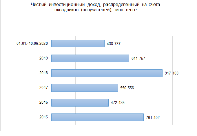 "Краткосрочные данные (ежедневные, ежемесячные и т.д.) являются непоказательными, так как зависят от ежедневной рыночной конъюнктуры. С января по 10 июня текущего года на счета вкладчиков был зачислен чистый инвестиционный доход в размере 438,7 миллиарда тенге. За 2019 год чистый инвестдоход, начисленный на счета вкладчиков ЕНПФ, составил 641,8 млрд тенге, (доходность – 6,57%), в 2018 году – 917,1 миллиарда тенге, в 2017 году – 550,6 миллиарда тенге, в 2016 году – 472,4 миллиарда тенге, в 2015 году – 761,5 миллиарда тенге. Инвестиционный доход, обеспеченный Национальным банком за период управления пенсионными активами с сентября 2013 года по май 2020 года, составил более 30 процентов в общем объеме пенсионных накоплений или 3,8 триллиона тенге", – проинформировала пресс-служба ЕНПФ.