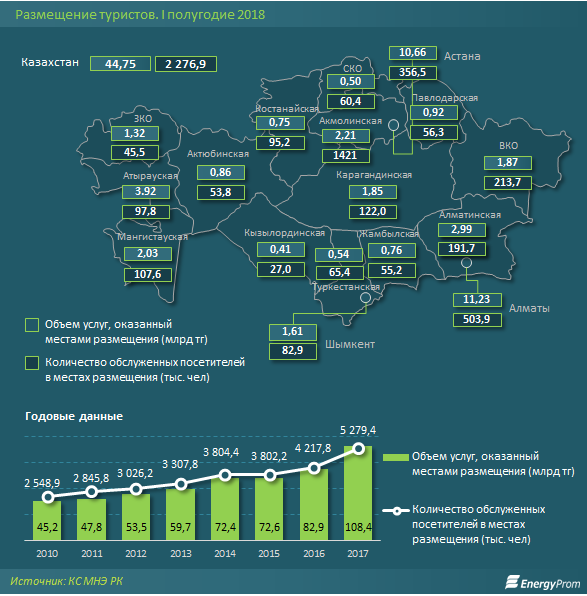 По данным агентства Нowmuch.net, в прошлом 2017 году туристы оставили в РК 1,78 млн долларов - страна занимает 78 строчку из 143 в рейтинге по этому показателю. Для сравнения, поступления от международного туризма занимающие первое место в рейтинге США достигли 210,75 млн долларов, а в России, находящейся на 34 позиции - 8,95 млн долларов.