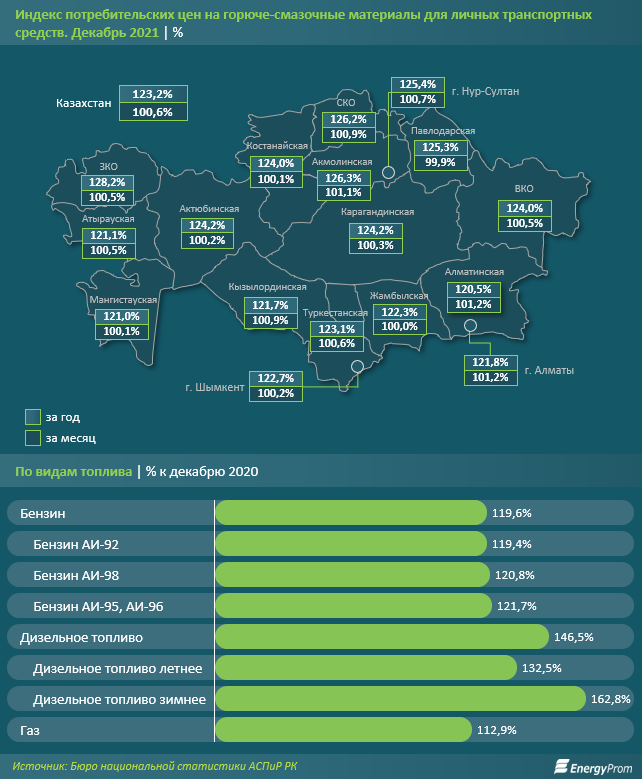 Тем временем рост цен на газ составил 12,9%. В декабре 2021 года литр АИ-92 стоил 180 тенге, АИ-95/АИ-96 — 209 тенге, АИ-98 — 231 тенге, литр летнего дизтоплива — 243 тенге, зимнего — 346 тенге.