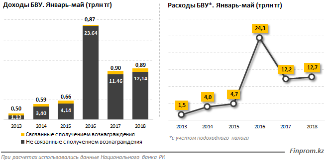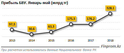 Чистая прибыль БВУ после признания всех расходов и подоходного налога составила 328,1 млрд тенге, что на 81,9% больше, чем за пять первых месяцев 2017 года (180,3 млрд тенге).