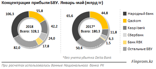 Лидером является Народный банк - 106,3 млрд тенге (годом ранее - 65,6 млрд тенге), Qazkom - 55,8 млрд тенге (годом ранее - 44,8 млрд тенге) и Kaspi Bank - 42,2 млрд тенге (годом ранее - 11,8 млрд тенге). Чистая прибыль трех перечисленных банков составляет 62,3% (204,3 млрд тенге) от всей прибыли банковского сектора. А топ-5 самых прибыльных БВУ за данный период заработало 75% всей банковской прибыли.