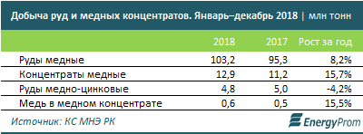 За прошлый год добыча медных руд составила 103,2 млн тонн, что на 8,2% больше, чем в аналогичном периоде прошлого года; медных концентратов - 12,9 млн тонн, +15,7% за год; медно-цинковых руд – 4,8 млн тонн, – 4,2% за год; меди в медном концентрате - 580,6 тыс. тонн, +15,5% за год.