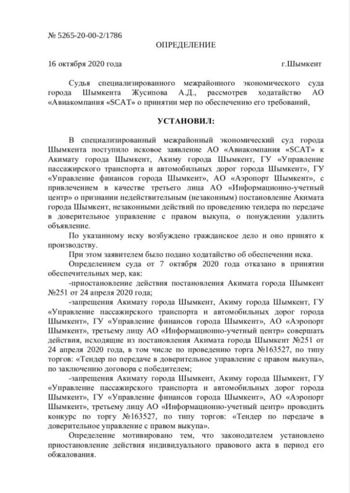 Руководство авиакомпании обратилось в специализированный межрайонный экономический суд Шымкента с заявлением не только на акимат города и градоначальника, но и на ГУ "Управление пассажирского транспорта и автомобильных дорог города Шымкента", ГУ "Управление финансов города Шымкента" и на АО "Аэропорт Шымкента".