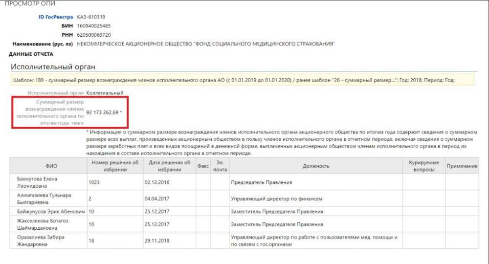 К слову, интерес журналистов к его доходам в должности главы ФСМС тоже неслучаен. Коллеги из газеты "Литер" изучили финансовую отчетность Фонда за 2018 год и выяснили, что первые лица организации получили в том году не только высокую зарплату, но и весьма солидные премии: если все суммировать - около 92 млн тенге только на пятерых человек. Правда, руководил тогда Фондом не Жумагулов, а Елена Бахмутова.