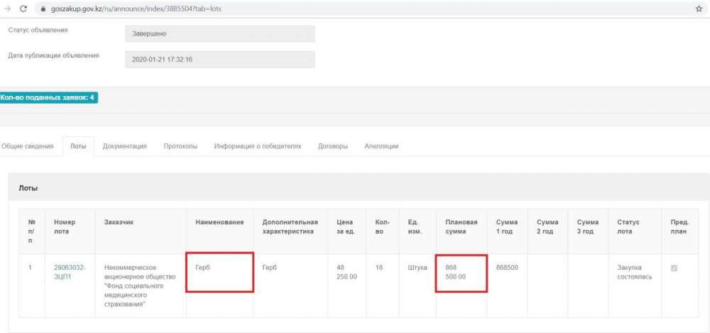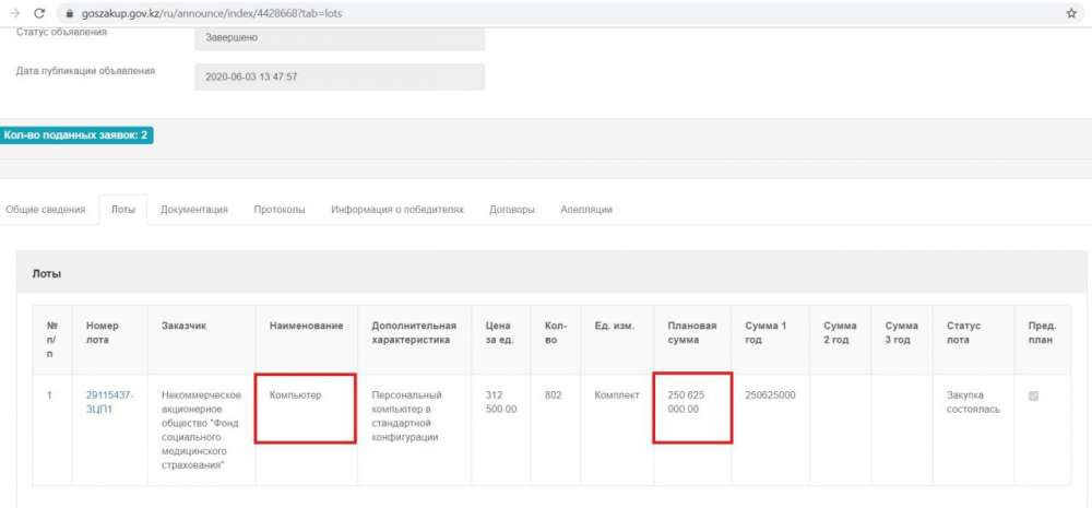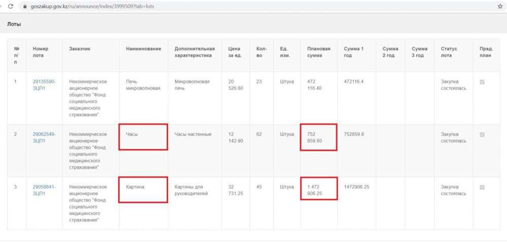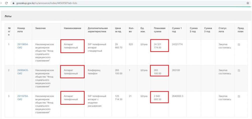 В июне 2020 года ФСМС приобрел 842 телефонных аппарата на сумму 30 493 449.28 тенге.