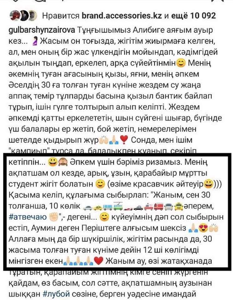 В казахстанском инфополе в топ самых обсуждаемых тем вновь ворвался отечественный Фонд социального медицинского страхования. Главным ньюсмейкером он стал, благодаря одной публикации в социальной сети Instagram, передает корреспондент BaigeNews.kz. Супруга председателя правления ФСМС сообщила своим подписчикам, что к ее 30-летнему юбилею муж подарил ей 12 (или 12 по счету) автомобиль.