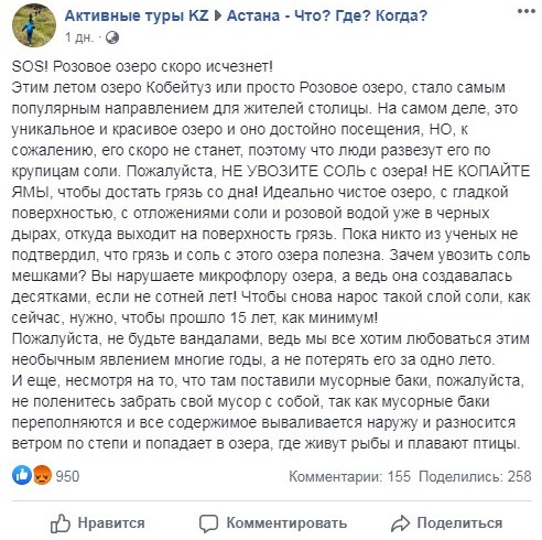 Ранее в соцсетях появились публикации, в которых пользователи рассказывали о неблагополучной ситуации на озере Кобейтуз. Из-за того, что люди увозят с собой соль и лечебную грязь с озера, оно оказалось на грани исчезновения, сетуют комментаторы.