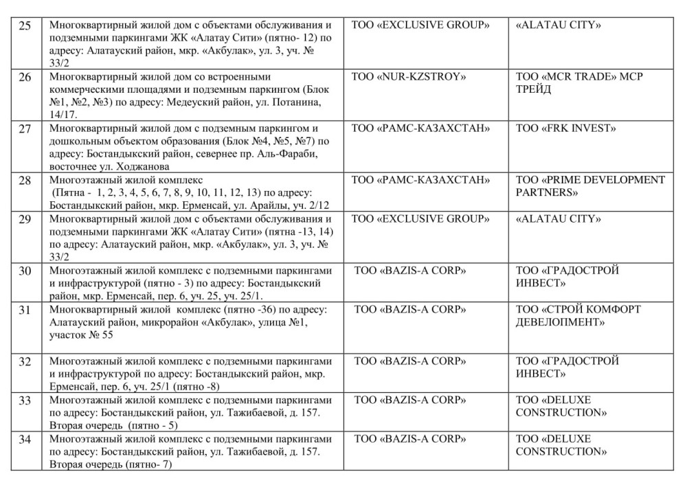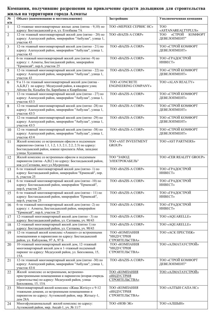 Ниже приведены компании, получившие разрешения на привлечение средств дольщиков для строительства жилья на территории города Алматы: