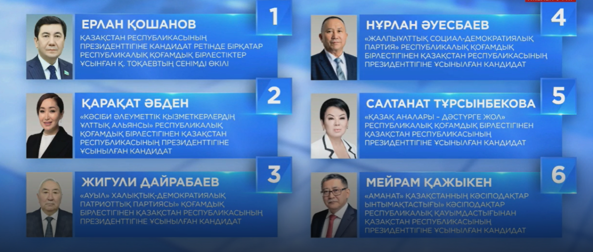 В дебатах участвуют все кандидаты, за исключением действующего президента Касым-Жомарта Токаева. Его представляет спикер мажилиса – председатель партии Amanat Ерлан Кошанов.