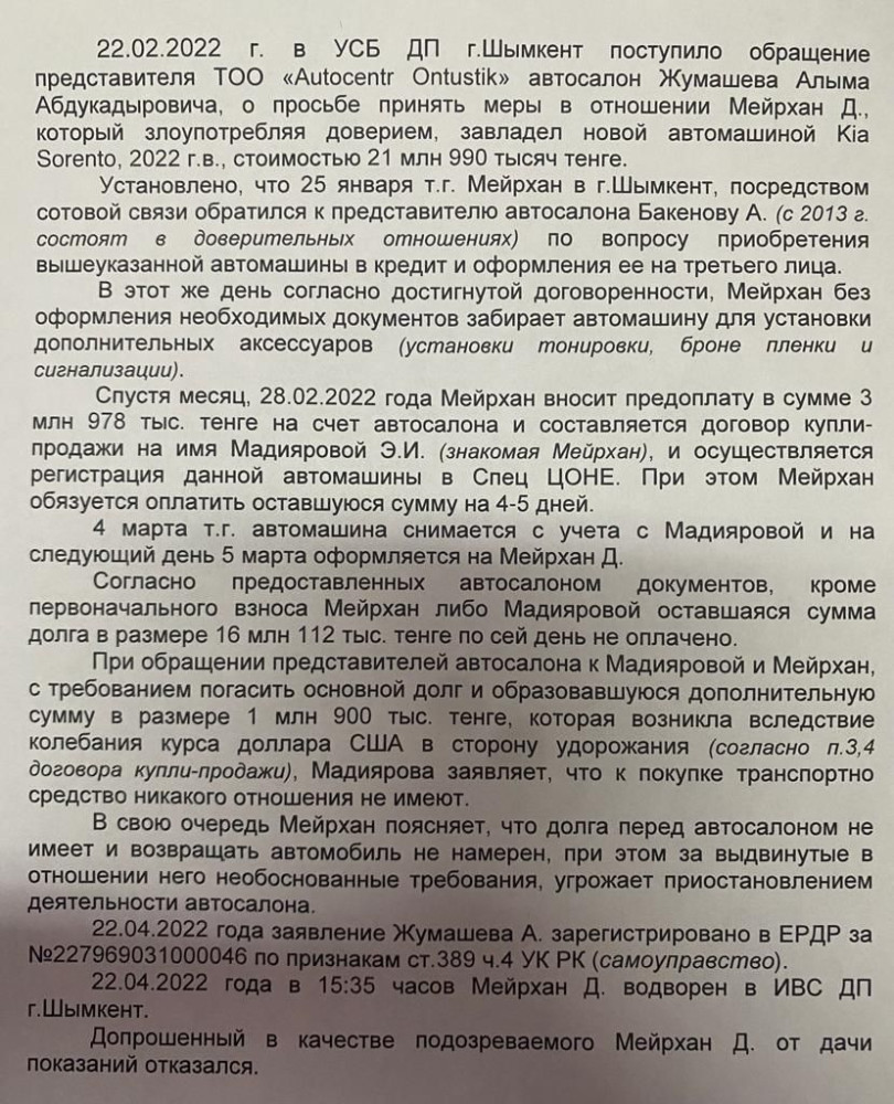 Начато досудебное расследование по статье 389 УК РК "самоуправство".