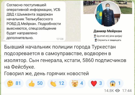 Как отмечает журналист Михаил Козачков в своем телеграм-канале, подозреваемым может быть Данияр Мейрхан - бывший начальник управления полиции Туркестана.