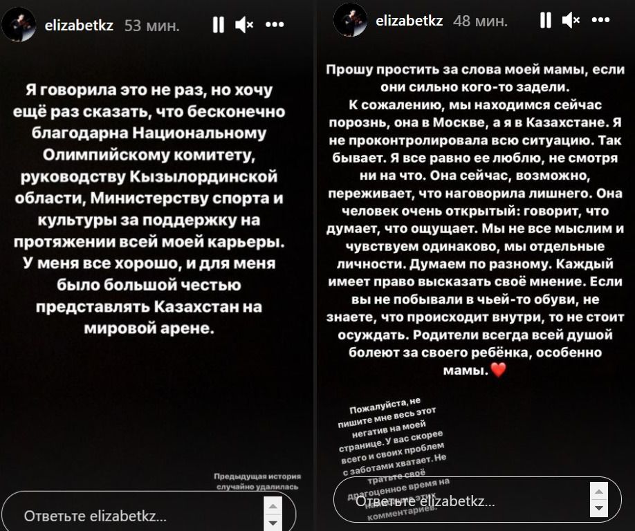 "Прошу простить за слова своей мамы, если они сильно кого-то задели. К сожалению, мы находимся сейчас порознь, она в Москве, а я в Казахстане. Я не проконтролировала всю ситуацию. Так бывает. Я все равно ее люблю, несмотря ни на что. Она сейчас, возможно, переживает, что наговорила лишнего. Она человек очень открытый: говорит, что думает, что ощущает. Мы не все мыслим и чувствуем одинаково, мы отдельные личности. Думаем по-разному. Каждый имеет право высказать свое мнение. Если вы не побывали в чей-то обуви, не знаете, что происходит внутри, то не стоит осуждать. Родители всегда всей душой болеют за своего ребенка, особенно мамы", − написала фигуристка в своем Instagram.