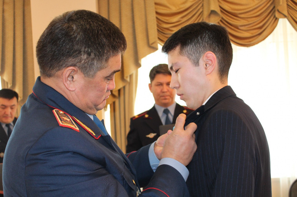23-летнему Темирлану Кадауову вручили медаль "Төтенше жағдайлардың алдын алуда және жоюда үздік шыққаны үшін". Награду молодой человек получил из рук главы алматинской полиции Серика Кудебаева.